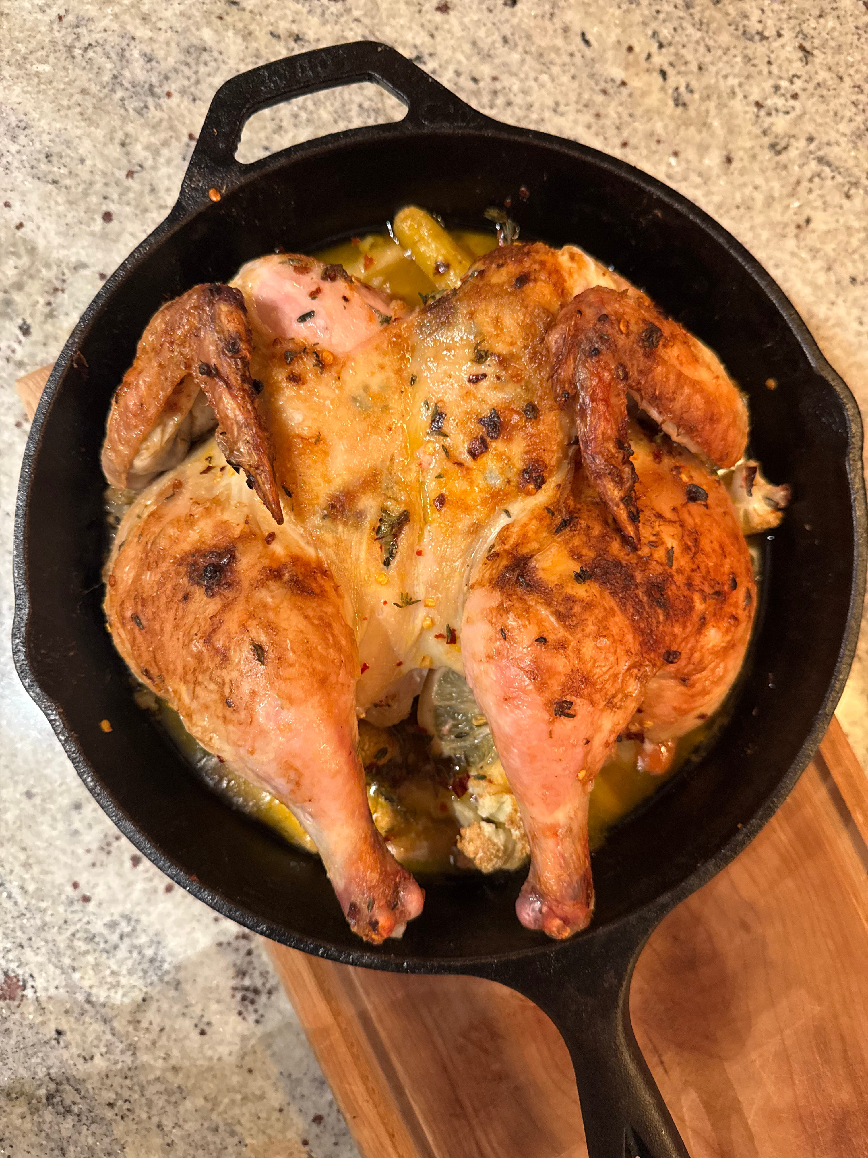 This recipe is one I sort of cobbled together out of my very rough understanding of what makes food taste good, i.e., butter and salt. A whole chicken can feel daunting, but it is underwhelmingly simple once figured out.