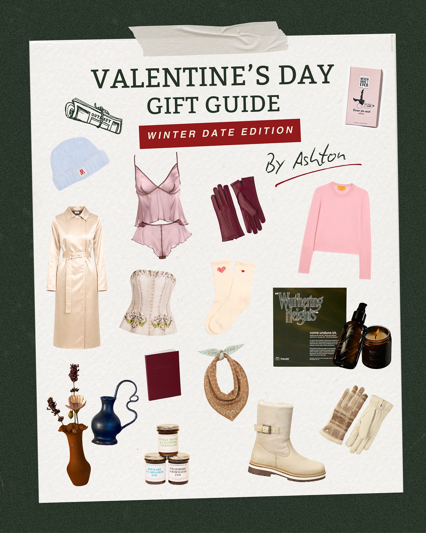 Last year valentines everywhere were gifted Santal 26, a candle made by an artisanal fragrance brand, Le Labo. What will be widely unwrapped across dimly lit dinner tables this year? Below find a few suggestions for your valentine; leather gloves, cashmere sweaters… and a Wuthering Heights massage candle.